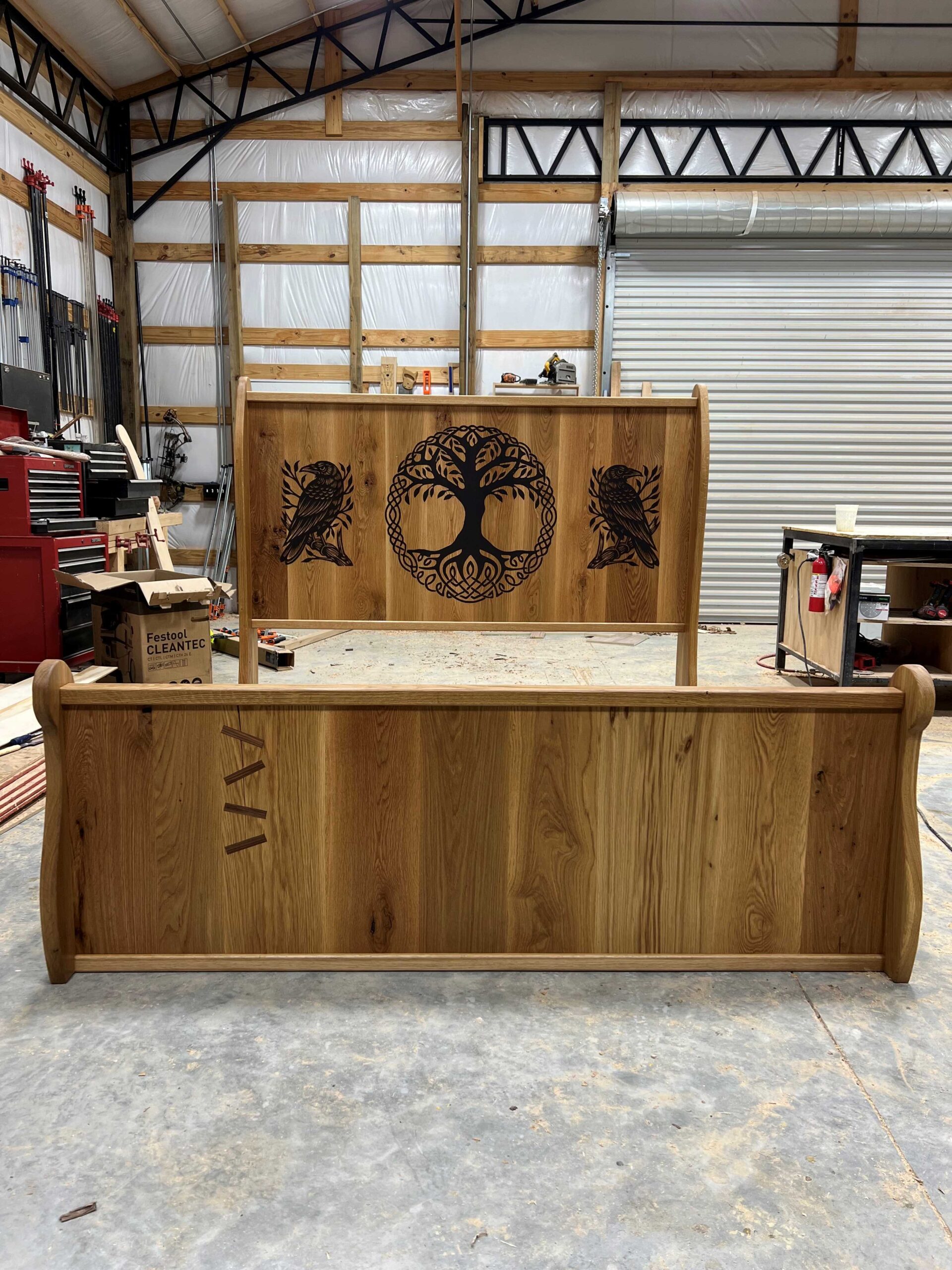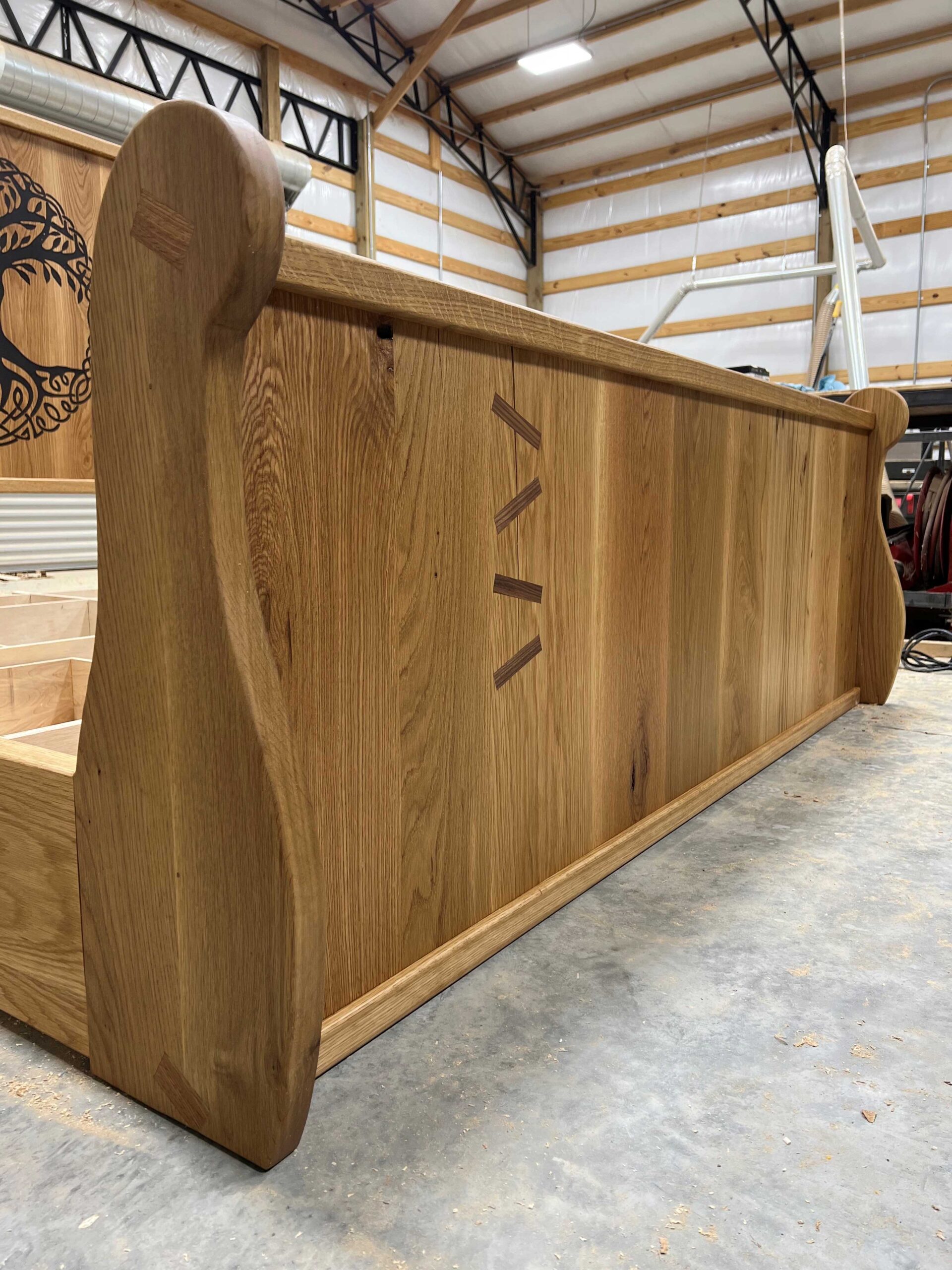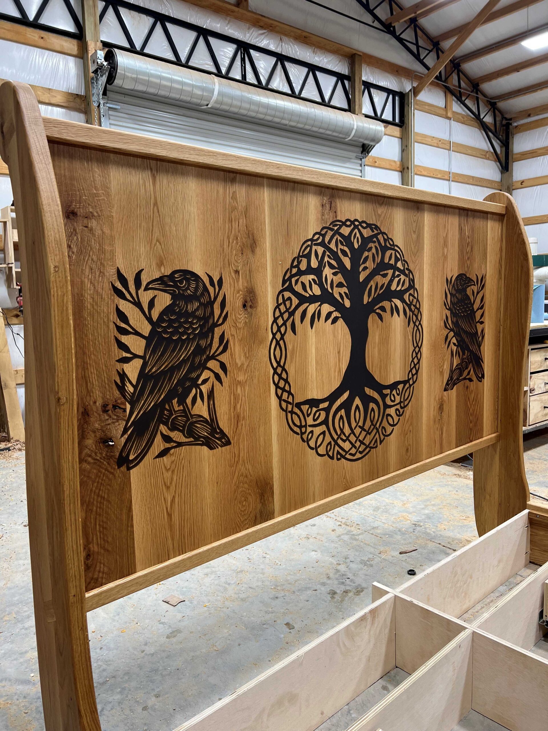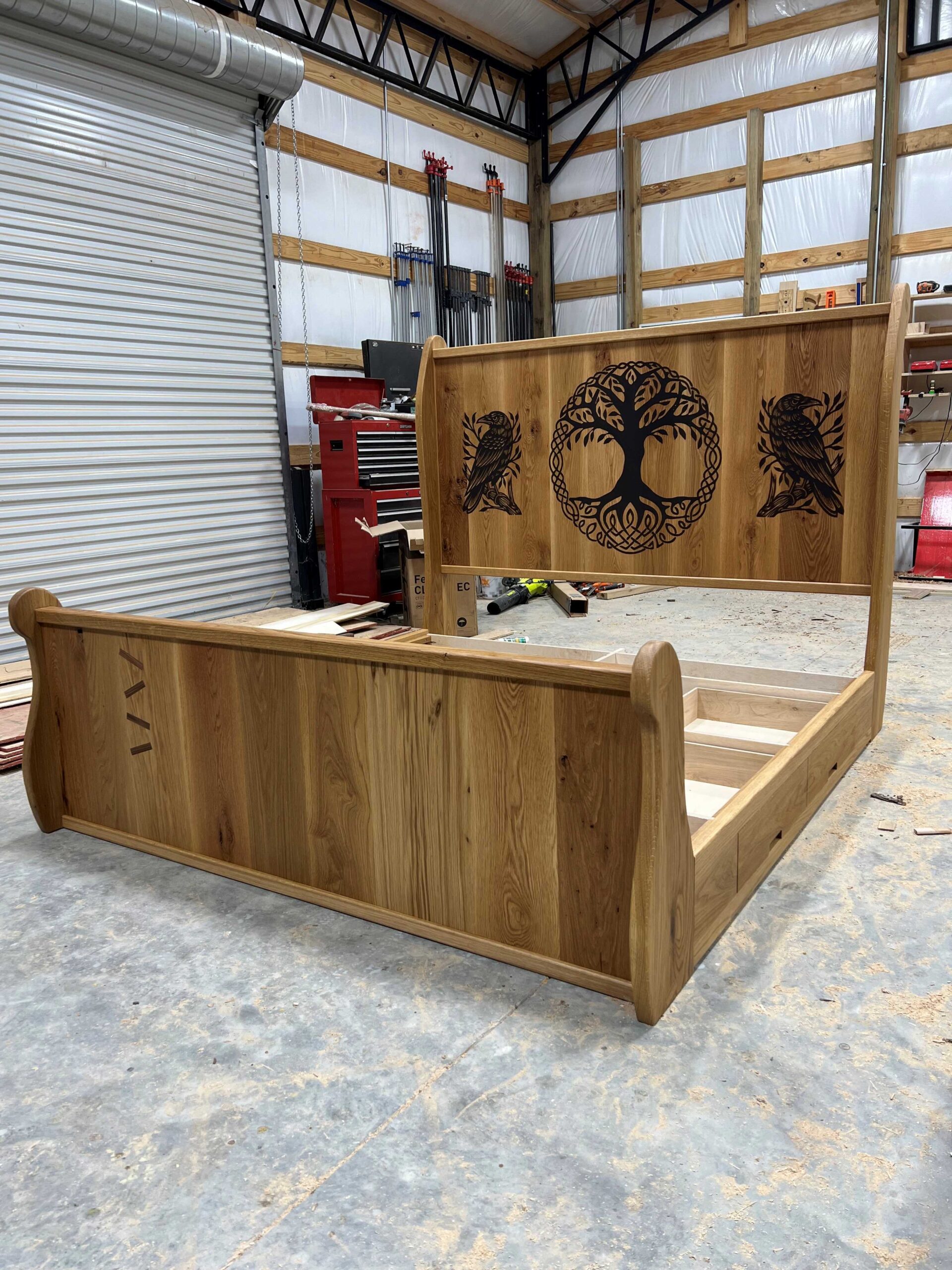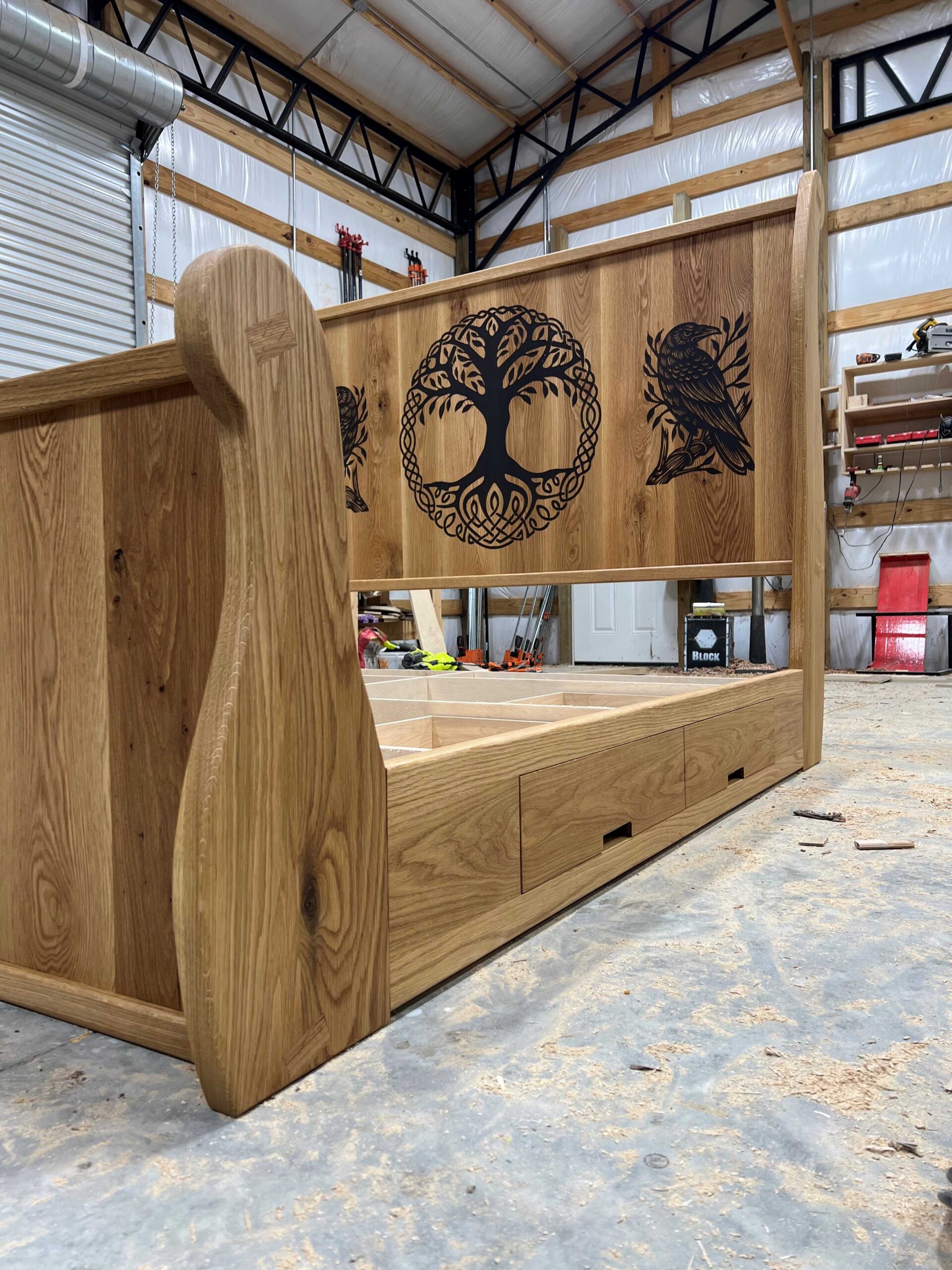 King Size Two 2′ wide drawers on each side Solid white oak construction Epoxy inlay design in headboard